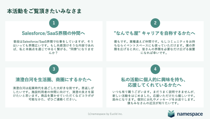 起業後は一貫して、私を育ててくれたIT業界、SalesforceやSaaS界隈の生態系のために何かインパクトのあることをしたい、そう思って仕事をしてきました。今回の活動も同じく、良い環境づくりになればと考えています。同志のみなさま、また応援頂けたら嬉しいです。