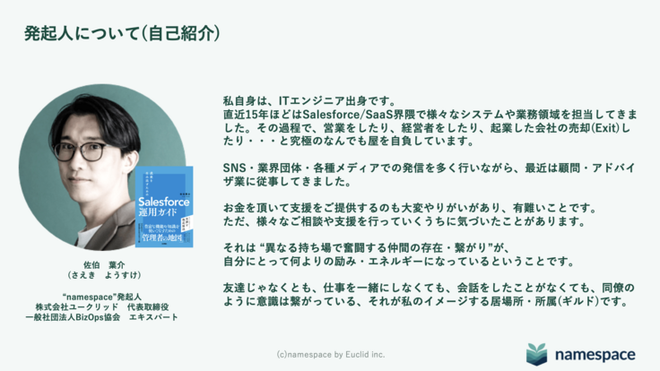 発起人の私佐伯はIT業界、なかでもSalesforce・SaaS業界出身のなんでも屋。