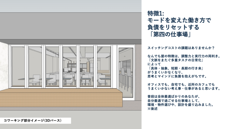 平日日中は、なんでも屋・ジェネラリストのための会員制のコワーキングスペースです。