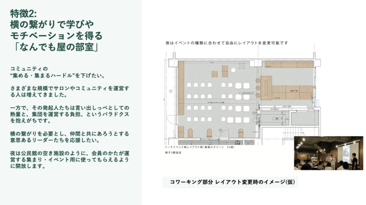 コワーキング部分は、可動式家具を一部使い、平日夜間や土日にイベントが開けるようにしています。