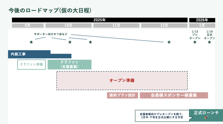 2026年1月に正式オープンで動いていきます。会員費や利用費用、カフェの提供内容など急ピッチで詰めていきます。