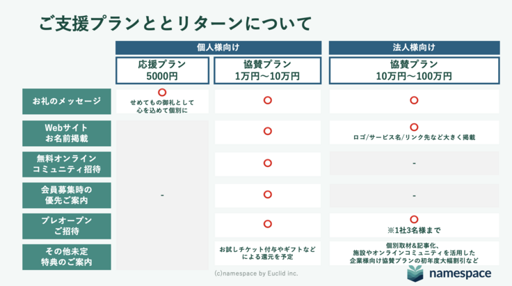 決まり次第、ご支援いただいた方へ特典や優先のご案内によって還元できることを増やしていく所存です。