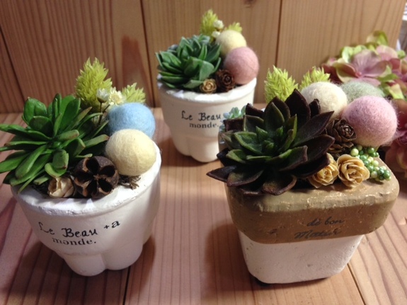 フェルトボールとアーティフェシャルフラワーのアレンジメント