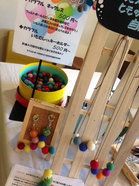 今回のイベントは、いろいろな体験ブースの他に先天性四肢障がい児父母の会パネル展示も同時にされ、売上の一部が会に寄付されるチャリティイベントでした。夏休みということもあり親子で楽しめる手作り体験をというご依頼でしたので、フェルトボールを使って遊んべる「いもむし君キーホルダー」作りと「ネックレス」作りのワークショップをご用意して出店してきました。