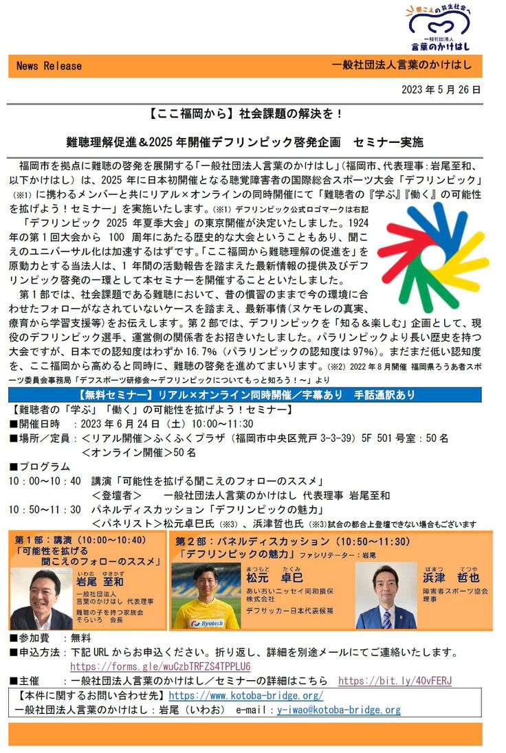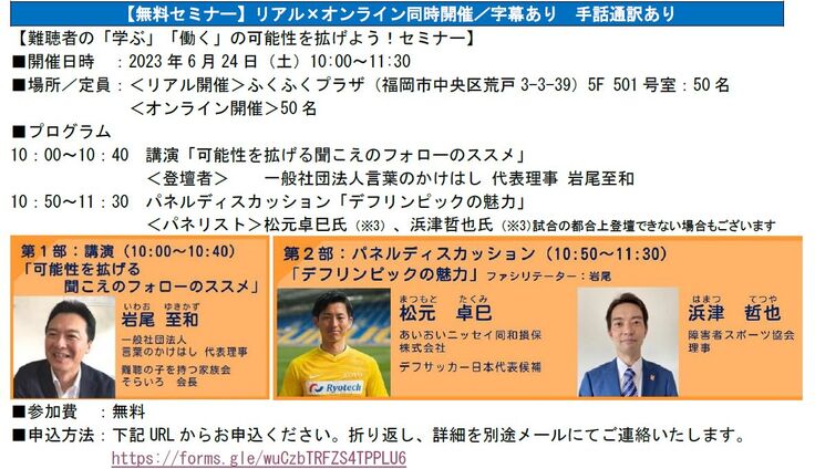 童謡「ほたる来い」にのせたギャクはさておき、昨年の同セミナーには、全国から150名以上ものお申し込みをいただきました。今回も既に30名以上のお申し込みをいただいておりますが、リピート率が高いのは嬉しい限り。昨年の1年間の活動を踏まえ、 難聴理解促進&デフリンピック啓発企画に向けて企画したセミナーですので、ぜひみなさまのお申し込み&ご参加お待ちしております。