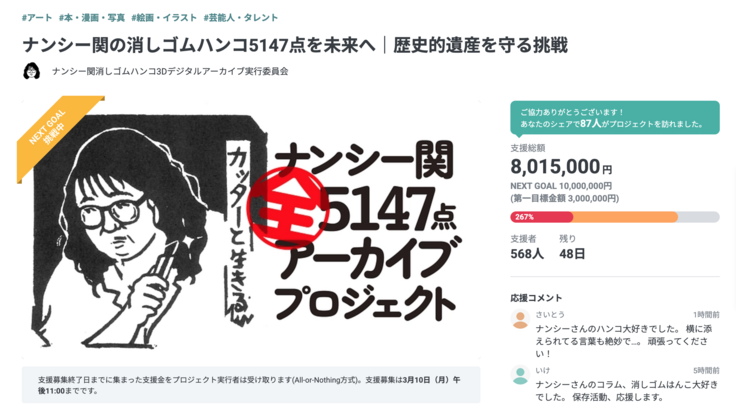 私たちは次なる目標として、 セカンドゴール1,000万円 を設定しております。これにより、約 1,500点 の消しゴムハンコを3Dスキャンし、デジタルアーカイブ化を進めることが可能となります。これまで支援してくださった皆さまと、ナンシー関さんの偉大な文化遺産を次世代に残すこの挑戦を、さらに力強いものとしていきたいと考えています。