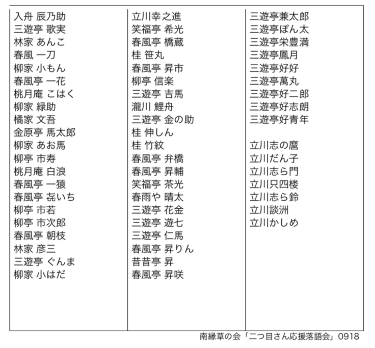 私達噺家仲間も同様に目を向けています。 真打になった時に、バネの様に飛び上がる人が沢山います。 皆さんでそんな二つ目さんの会を作ってあげてください。私達も楽しみにしています。 是非応援して下さいませ。