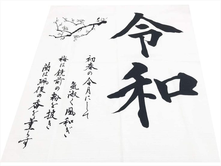 張りのある上質な綿素材に鮮やかな黒で描かれた令和の文字と梅の花。「令和」の典拠、いわゆる出典は「万葉集」の梅花の歌、三十二首の序文が描かれています。50cm×50cmの大きさでお部屋に飾れば一気に空間が華やぎます。黒の艶やかな色使いに少しリッチな印象もあります。物を包むだけではなく、敷物として、お部屋のインテリアとして飾って、毎日を楽しんでいただける小風呂敷となっています。