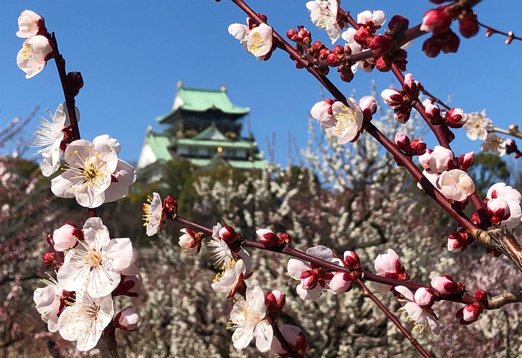競技かるたにおいて、一番最初に読まれる和歌である 「難波津に 咲くやこの花 冬ごもり 今を春べと 咲くやこの花 王仁」 古今和歌集より でも詠まれているように梅は大阪にゆかりの深い花です。ちなみに、大阪城の内濠の東側には約1.7haの広さに1300本の100品種を超える梅が植えられています。