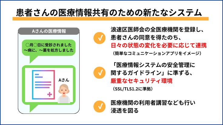 これは、電子カルテの導入を前提とするのではなく、スマートフォンなどの端末から、セキュリティを考慮した上で、普段使い慣れているLINEのような感覚で利用できるSNSに近いシステムの導入を目指すものです。