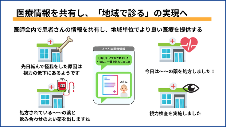 それぞれの医療機関がバラバラに診るのではなく、同じ患者さんの情報をもとに、一つのチームとして支えること、すなわち「地域で診る」ことが、安心・安全な地域医療の基盤です。