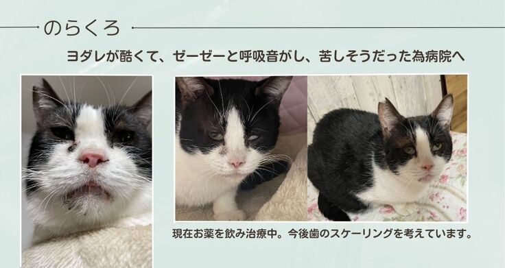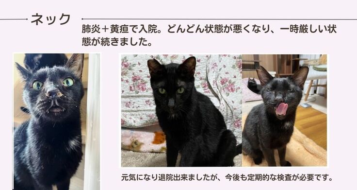 彼らは今回のクラウドファンディングの対象ではありませんが、猫の病気の具体的な事例について、少しでも参考になればとご紹介させて頂きました。ネック・のらくろ・ハッチ、全員多頭飼育崩壊宅から引取った子達です。