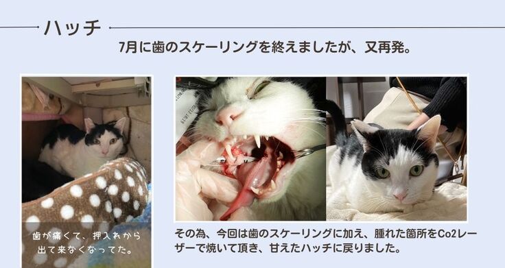 昨年7月に歯のスケーリングをしたばかりでしたが、歯茎が痛むのかご飯を食べるとパニックを起こし、怯えて押入れに籠るように。そのため再度スケーリングと、今回はCO2レーザーで歯茎を焼いてもらいました。