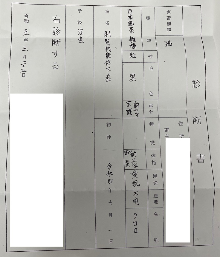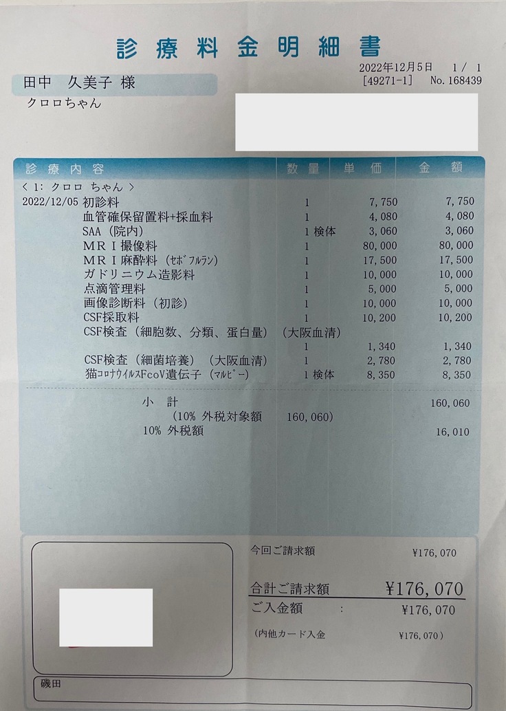 ※クロロの治療費の内、2022年10月以降、H病院でかかった費用のみをクラウドファンディングの対象とさせて頂きます。(領収書や診断書等は下に添付しています)