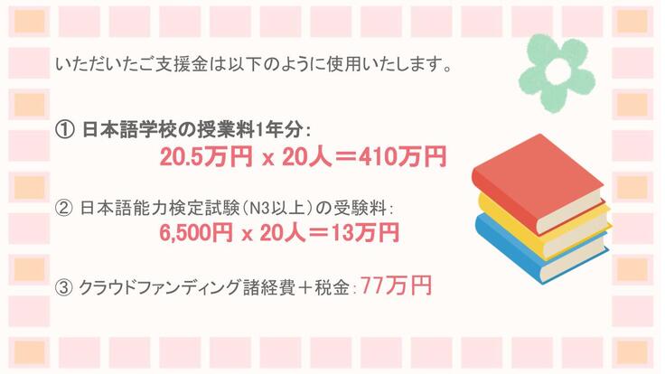 ネクストゴールでいただいたご支援金については、2022年度に日本語授業を提供する人数の拡大、あるいは2023年度に日本語授業を提供するための費用の一部として、大切に活用させていただきます。