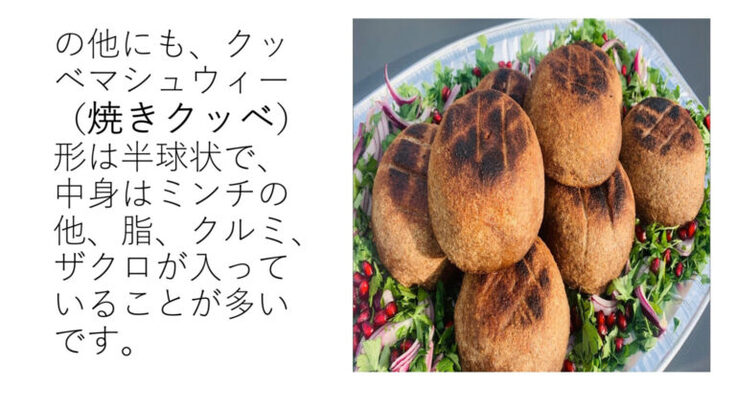 シリア出身の生徒さんの発表では、シリアの代表的な料理の1つ「クッベ」について教えてくださいました。クッベとは球・玉を意味し、ブルグルと羊肉をすりつぶしたペーストを用いた料理の総称だそうです。