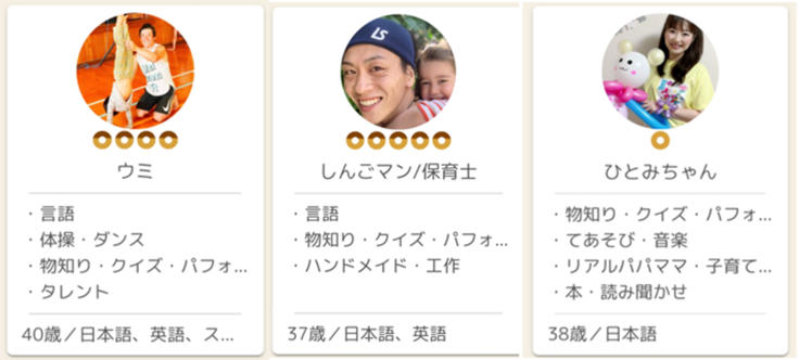 元シルクドソレイユのパフォーマーや、歌のお姉さん、 大学の地域社会学の教授や世界を飛び回るスーパー保育士、 バルーンパフォーマーや外国人などなど…