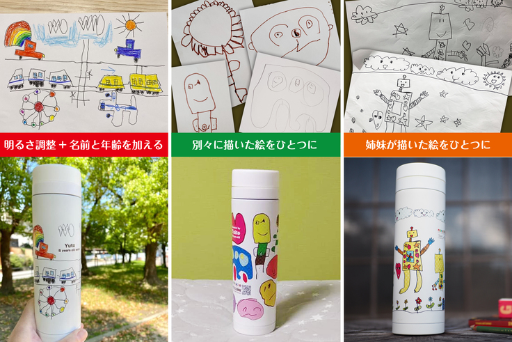 ▲お子様の絵からオリジナルのサーモボトル(ペア)を制作します。
