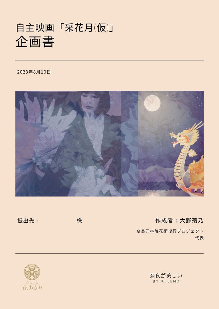このプロジェクトは、元林院、奈良、芸妓 芳菊、そして今回奈良の地元で、愛され皆さんのお力で続く「采女祭り」その元になった「采女伝説」からイメージをいただき、舞台を現代、少し前の奈良元林院に換え、俳優 加藤雅也氏を総合プロデューサーとしてむかえ、切ない恋心とすれ違いを描いた短編映画を作成するプロジェクトが開始いたしました。