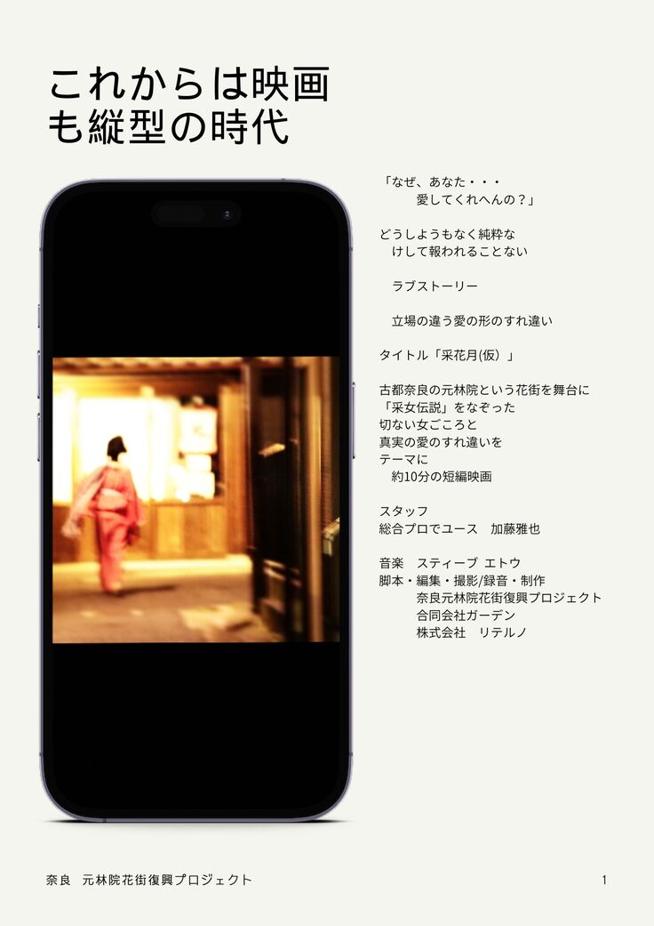 それは、制作予算の問題もあり、作ったもので収益を上げる方法がないのが現状です。短編の映画といえど制作コストは結構な金額がかかってしまいます(およそ200~500万)。しかし、今回のような縦型の動画の可能性を考えると、通常の短編作品の1/3ぐらいのコストで作ることができ、その制作コストをドネイションやクラウドファンディングで確保できれば、プラットフォームは無料配信のプラットフォームで可能であると考えました。そして、広く「世界中に伝える」ことができます。そして、様々な人種の方が私共の花街はもとより、奈良へ起こしいただければと考えております。これからの奈良のため、そして文化、花街 元林院の為に何卒このプロジェクトにお力をお貸しくださいませよろしゅうお願い申し上げます。