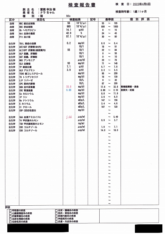 猫の感染症を示す重要な指標となる血清アミロイドというものがあるそうなのですが、それが上昇し少し高いようでした。