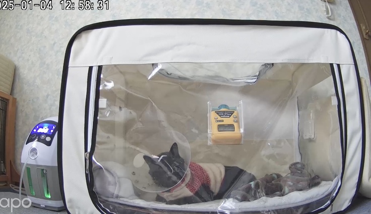 呼吸状態が悪かったので酸素室へ入れて、朝の注入は中止して仕事に行きました。