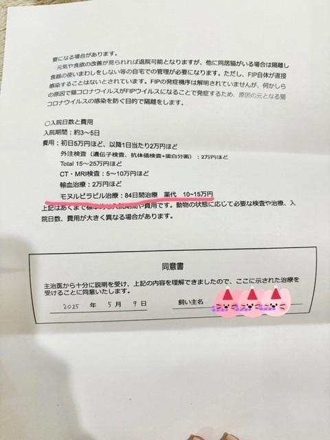 かなり貧血が進んでいるので輸血を予定されてます。FIPは治療費が高額で100万近く必要になるそうです。