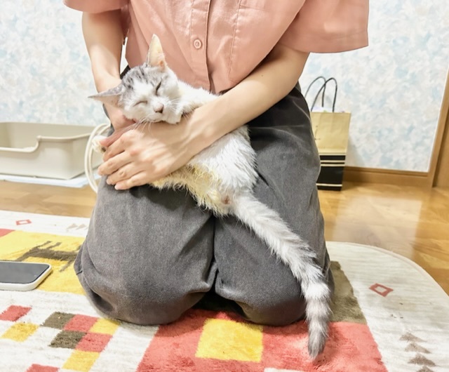 亡くなる前日には、保護主さんが心配して遠方から会いに来てくれました。抱っこしながら撫でてもらってる表情はほんとに嬉しそうでした。早く元気になって母猫に会わせてあげたいねと話をしてました。