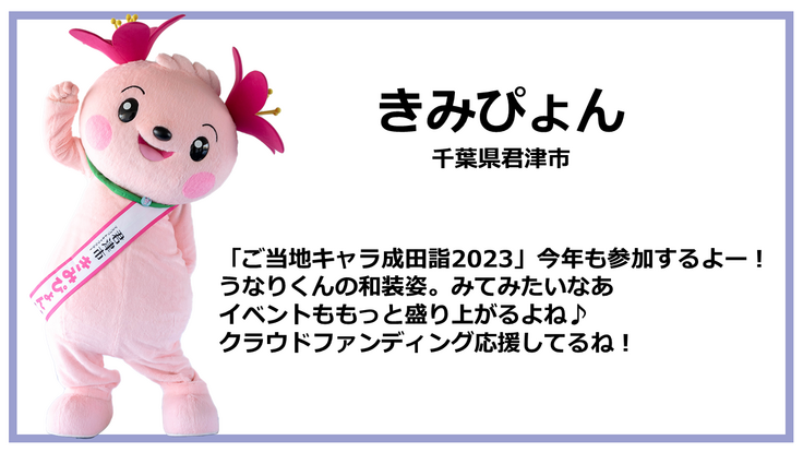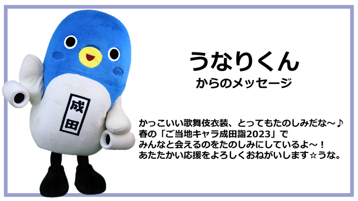 「ご当地キャラ成田詣2023」イベント当日には、皆様のご支援のもと制作した歌舞伎衣装姿のうなりくんをお披露目できますことを楽しみにしております。
