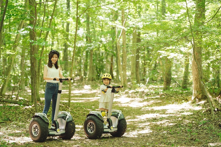 セグウェイで有名な電動立ち乗りボード「ジャイロライド」で、森林浴をしながら那須の大自然を自由に走ることのできる日本初のアトラクションです。ジャイロライドパークのコースは基本的に人工物を使わず、森林管理で発生した管理伐採樹木や倒木を活用し、コースなどに利用しています。