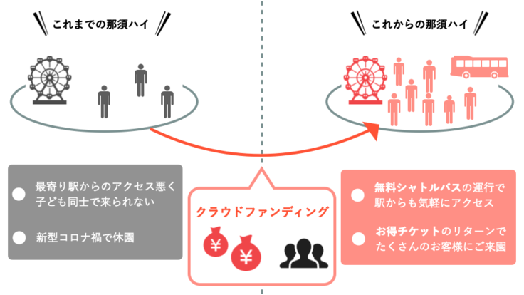 たくさんのお客様に足を運んでいただくために、これまで以上に皆様にお越しいただきやすくなるよう、環境を整えること。それが、那須ハイの現状を回復させ、これからの那須ハイを盛り上げてくれるのではないか考え、無料シャトルバスを運行費用をクラウドファンディングで調達することを決めました。