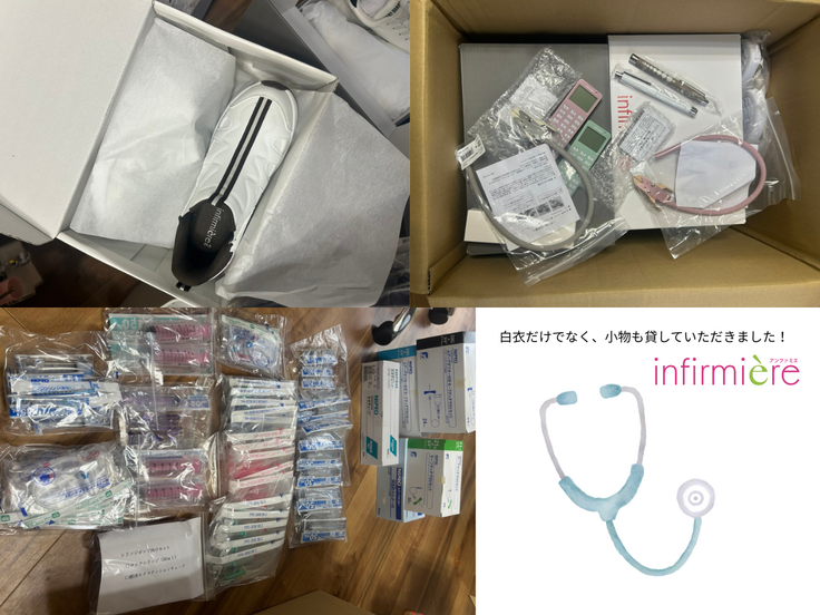 体験に必要な物品に関してはニプロ株式会社様、アンファミエ(株式会社ナースステージ)様など企業にも協力をいただけることになりました!物品も届きました。