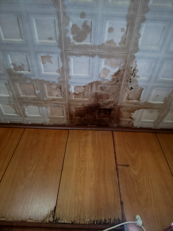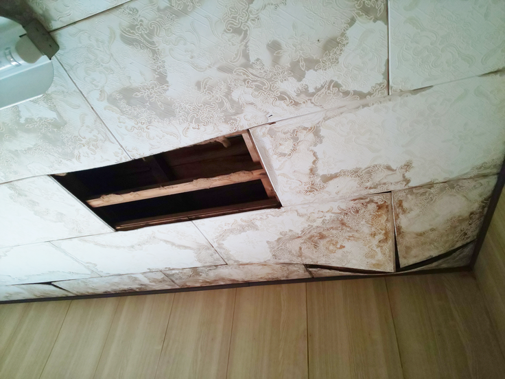 屋根が劣化して、天井のいたる所に染みができて雨漏りしています。