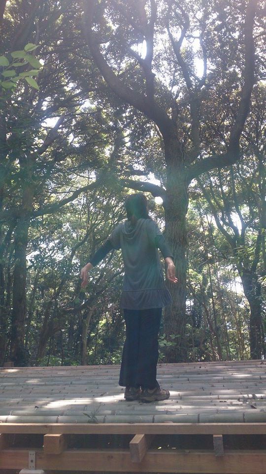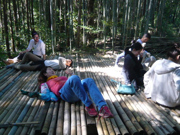 2012年冬ガンコ山の森と里道整備は棚田の方へと向かっていった。棚田復元の前にここに続く森を整備するのだ。荒神の森を整備して、そこは見事な気の漲る森に甦った。木々の山に迫ってくるのは放置された竹の林、竹やぶ軍団であった。【じゅりんヨガ】チームは、森に侵入するこの竹をナタをふるいノコを引き駆逐していった。そして、この藪化した竹林自体を整備することにもした。整備とともに切られた竹を使いヨガで使う瞑想台を作ることにした。神域である荒神の森と人域である竹林を結ぶところに作ったので縁結び台と名づけられた。