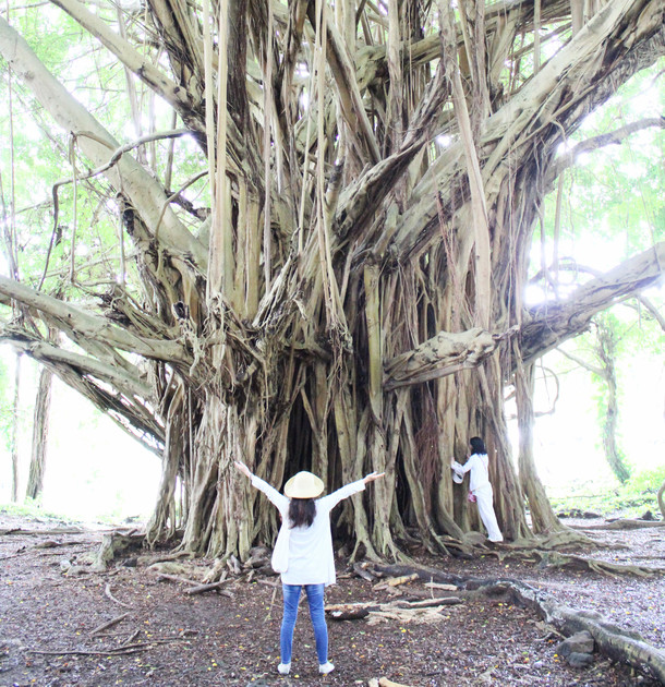 近寄ると圧巻!の巨大な木の中に入り木漏れ日を感じたり、滝を訪れては天地と繋がるワークも行います。