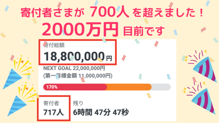 ご寄付総額は2000万円目前、寄付者さまの数は700人を突破しました。