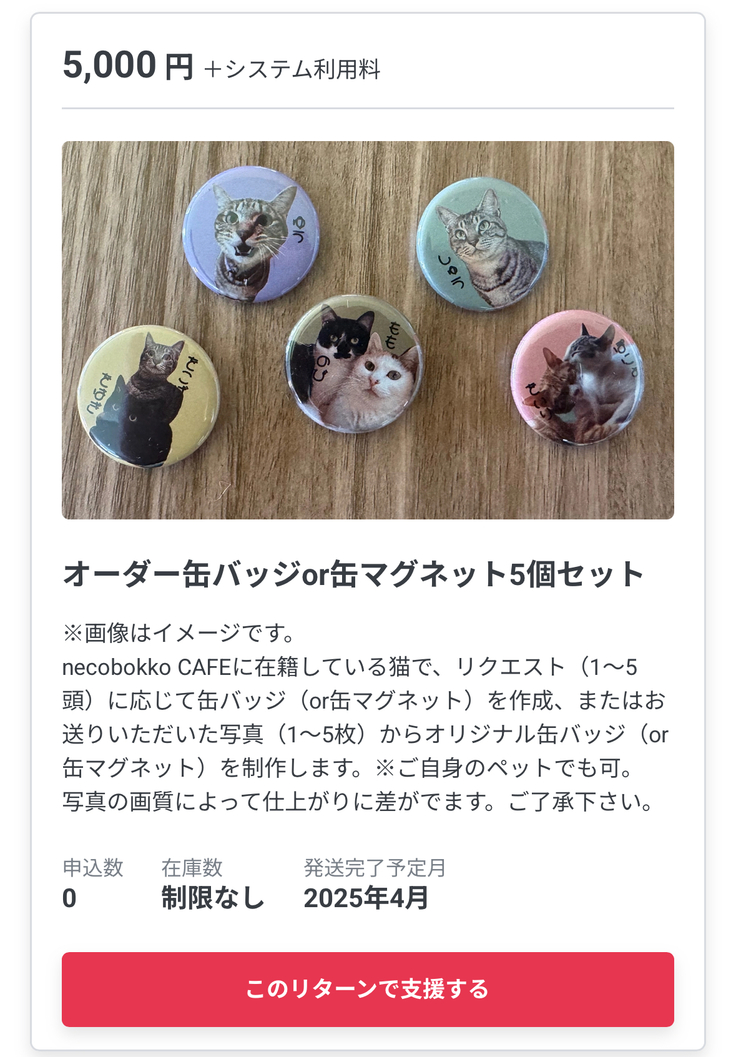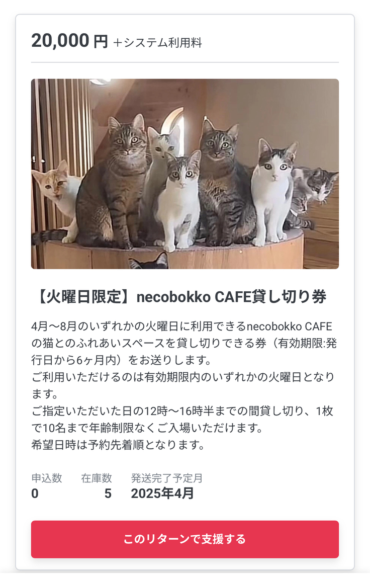 リターンは保護猫のチェキ1枚に、応援メッセージとお名前を代理で記載し、店舗の専用スペースに貼らせていただきます。