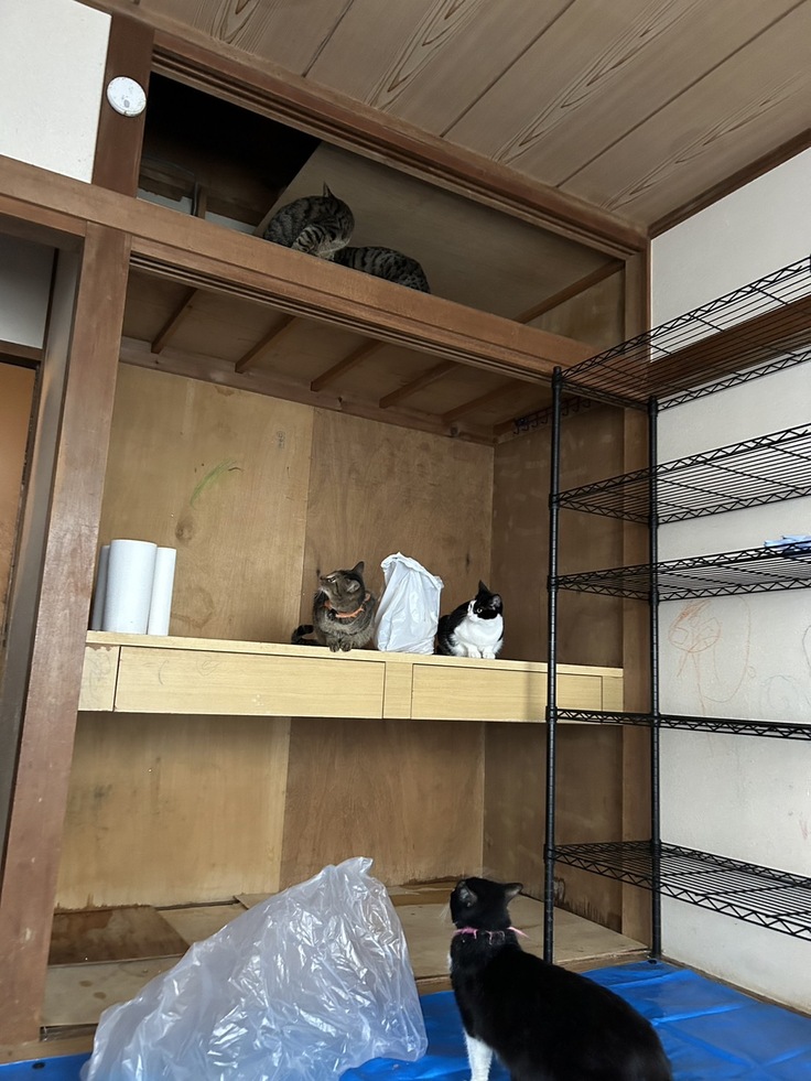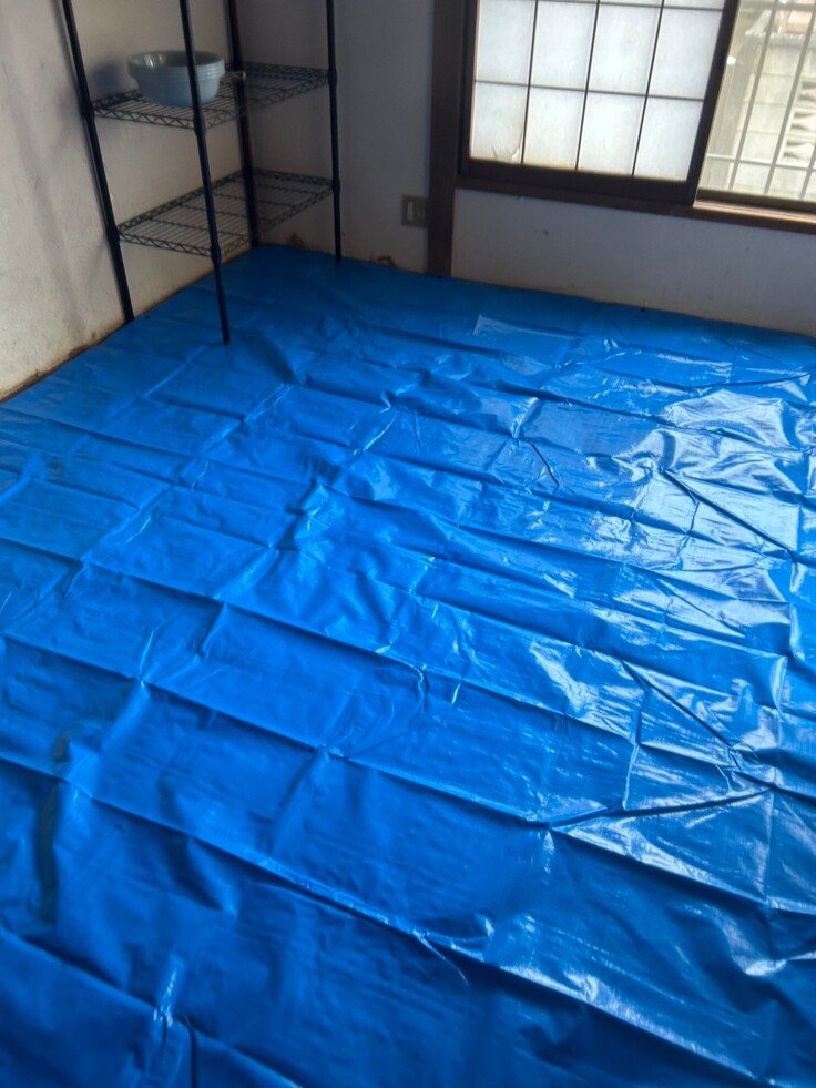 1部屋だけは猫の食事スペースとしてブルーシートを敷き、トイレ、食事、水を設置してきました。