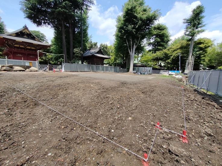 6月2日 地鎮祭後、まっさらになったところに地縄(建物の位置を示しています)を張って、