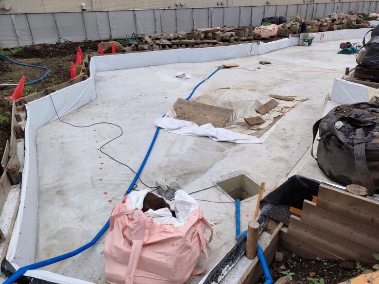 現在は、コンクリートを打って、池の護岸に石を置く位置を大体決めているところです。