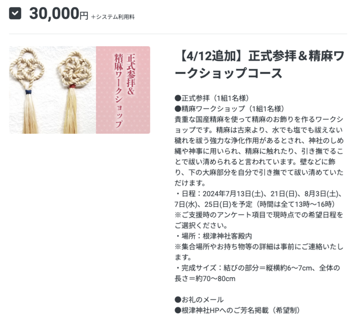 正式参拝&精麻ワークショップを体験できるリターンを追加しました!
