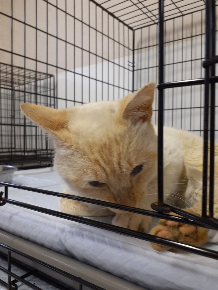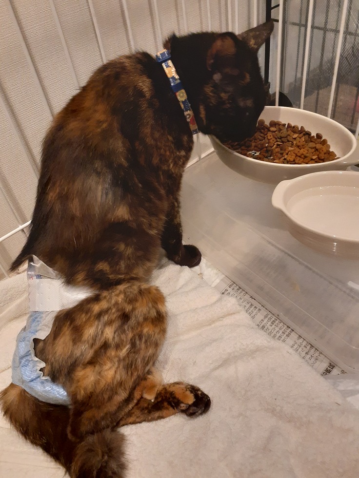 尻尾が壊死した状態で保護。手術にて長い尻尾を切断しました。譲渡にはつながらず次の仮の誕生日で17才。