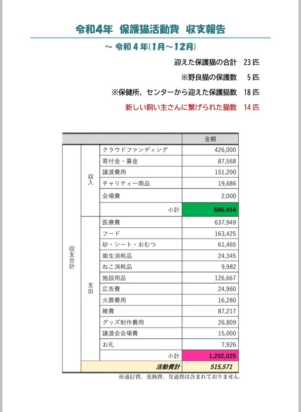 やはり、傷病猫を中心に引き出ししていますので治療費がかなりかかっていました。