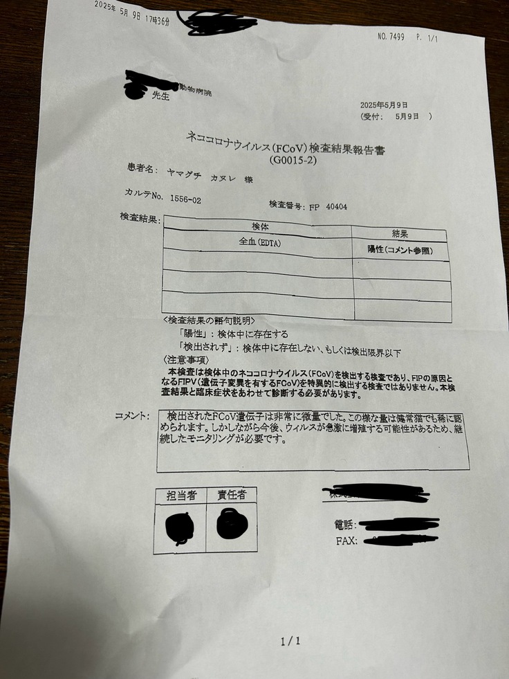 精密検査で「FIP(ドライ型)・エイズ陰性」と確定しました。