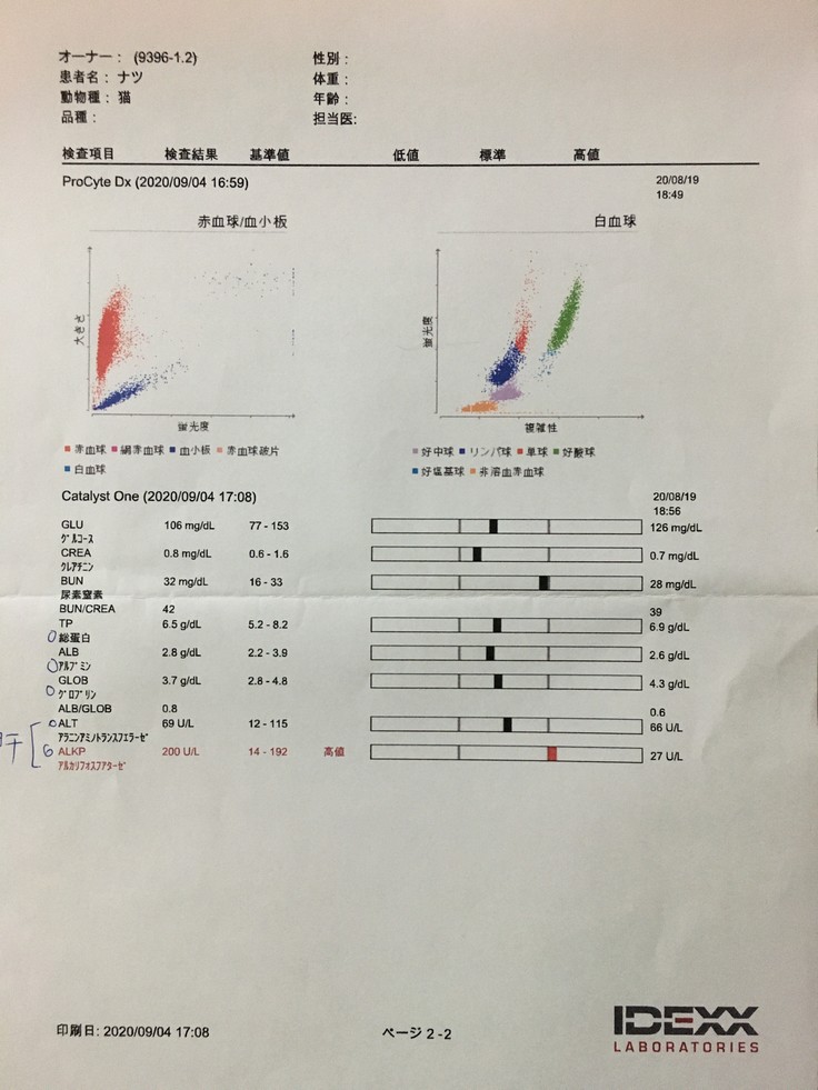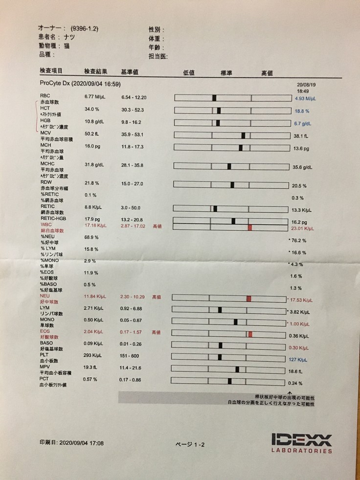 やや高めの赤字の項目は、薬(抗生剤、ステロイド)の服用も影響するようで、許容範囲内だと言われ、安心しました。