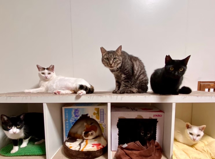 ケージの上やキャットタワーはもちろん、実は隠れ家になるベンチの下も大人気です。また、ボランティアさん手作りの段ボールのおうちも猫たちで賑わっていますよ。