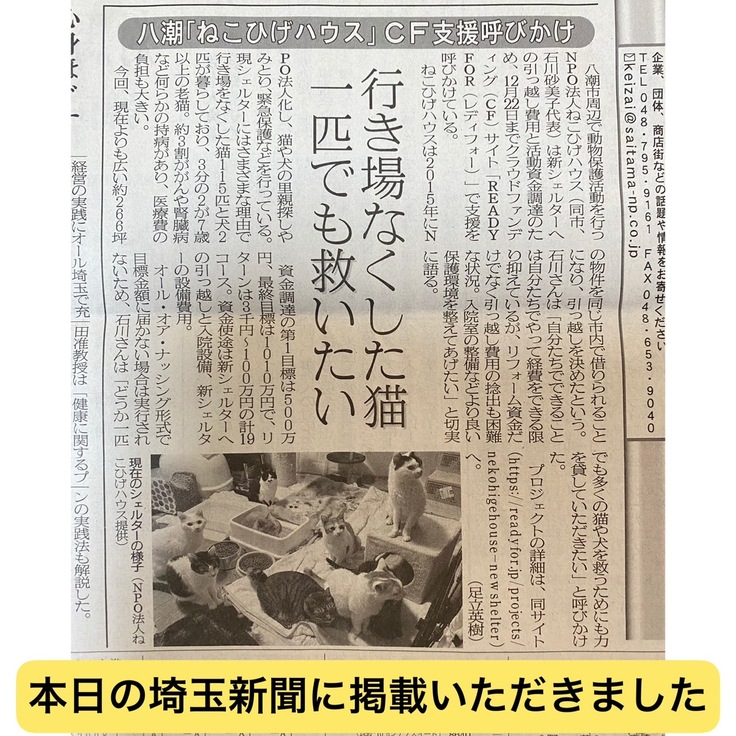 本日(10月27日)の埼玉新聞さん朝刊にて ねこひげハウスのクラウドファンディングの記事を掲載していただきました!