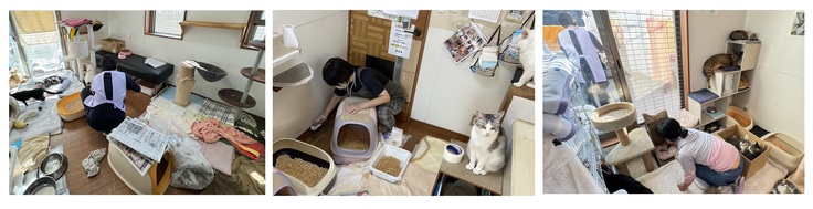 猫たちの様子に目を配りながらお掃除をしていきます。