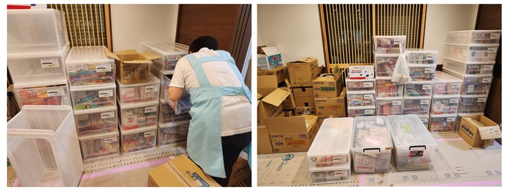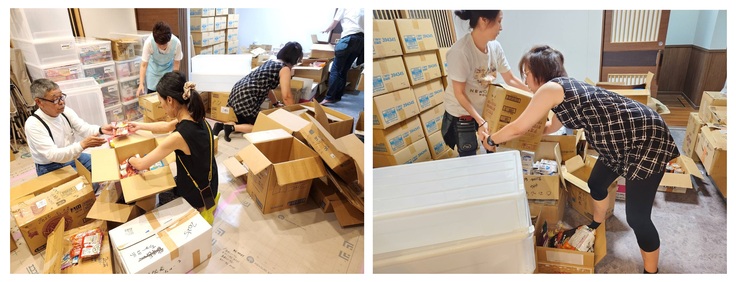 予定した通りの保管場所とは異なってしまったため、保管ケースを新たに設置して、急ピッチで備蓄フードや医療品、器材などを移動したりとスタッフ総出で整理や設備設置に取り掛かっています。