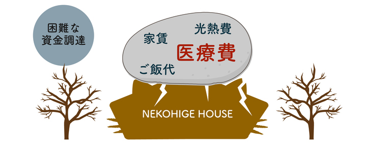 ねこひげハウスの医療費は年々かさんでおり、負担が大きくなっています。またハウスの維持費用の家賃、光熱費、餌代、など毎月とてもかかります。